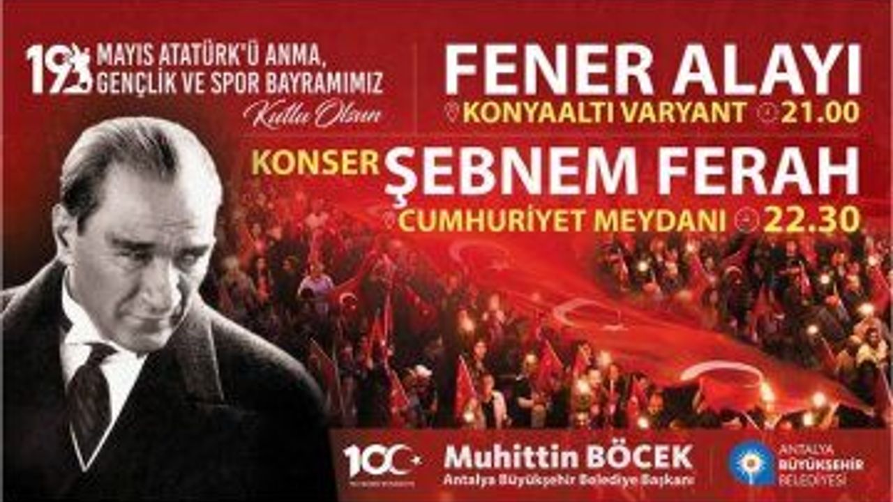 BÜYÜKŞEHİR Belediyesi, Ulu Önder Gazi Mustafa Kemal Atatürk'ün 19 Mayıs 1919'da Samsun'a ayak bastığı Milli Mücadelemizin 100. yılını büyük bir coşkuyla kutlayacak. Büyükşehir Belediyesi 19 Mayıs Gençlik ve Spor Bayramı olan Pazar günü, saat 21.00'da Konyaaltı varyantından Cumhuriyet Meydanı'na fener alayı düzenleyecek. Dev Türk Bayrağı eşliğinde gerçekleştirilecek fener alayı yürüyüşünün ardından saat 22.30'da Cumhuriyet Meydanı'nda ünlü sarkıcı Şebnem Ferah Antalyalılarla buluşacak.19 Mayıs coşkusu Şebnem Ferah konseriyle katlanacak.