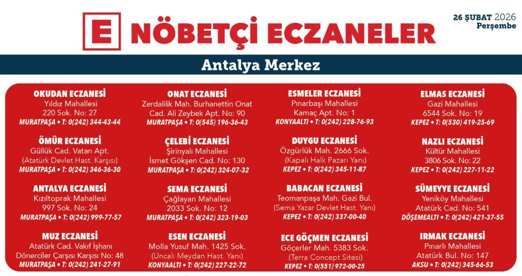 İşte Antalya'nın merkez ilçelerinde bugünkü nöbetçi eczane listesi;