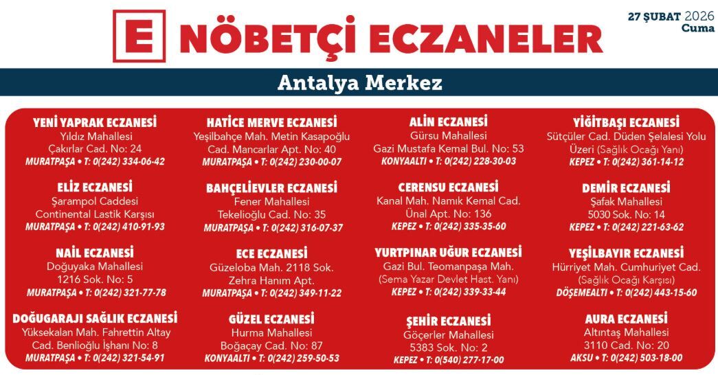 İşte Antalya'nın merkez ilçelerinde bugünkü nöbetçi eczane listesi;