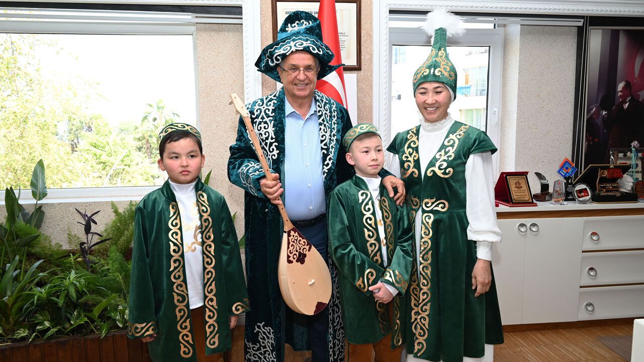 Başkan Topaloğlu'nun kendisine hediye edilen Kazakistan'ın yöresel kıyafetini giymesi renkli görüntüler oluşturdu.