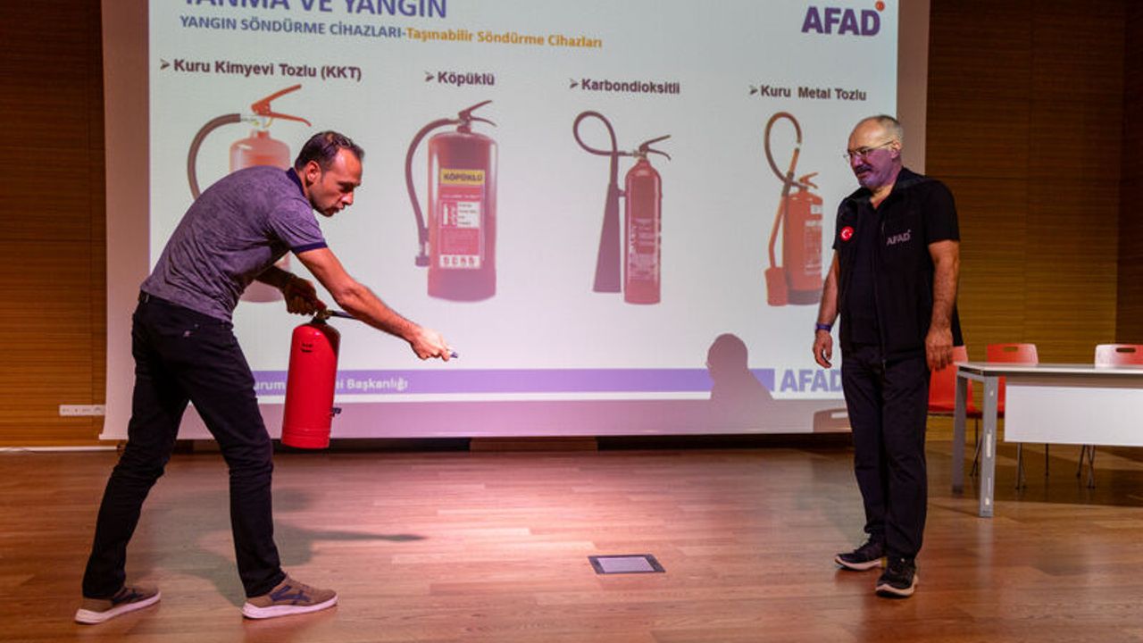 Atatürk Kültür Merkezi’nde gerçekleştirilen eğitim programında, katılımcılara afet ve acil durumlarda yapılması gereken temel uygulamalar, yangın söndürme cihazlarının doğru kullanımı, tahliye yöntemleri ve ilk müdahale prensipleri hem teorik hem de uygulamalı olarak aktarıldı.