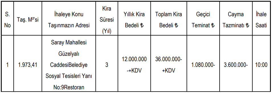 İhaleye konu olan taşınmaz, Saray Mahallesi Güzelyalı Caddesi üzerinde, Belediye Sosyal Tesisleri yanında yer alan 9 numaralı restoran alan. Toplam 1.973,41 metrekare yüz ölçümüne sahip olan bu taşınmaz için 3 yıllık kira süresi belirlendi.