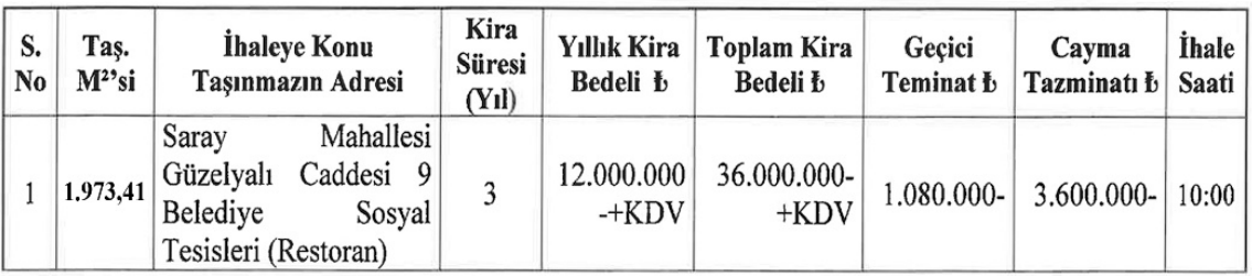 Saray Mahallesi Güzelyalı Caddesi 9 numarada bulunan Belediye Sosyal Tesisleri (Restoran) vasıflı taşınmaz için 3 yıllık bir kiralama süresi öngörülüyor. Belediye tarafından belirlenen yıllık muhammen kira bedeli 12.000.000 TL + KDV iken 3 yıllık toplam kira bedeli ise 36.000.000 TL + KDV olarak açıklandı. İhaleye katılmak isteyen isteklilerin 1.080.000 TL tutarındaki geçici teminatı ve 3.600.000 TL tutarındaki cayma tazminatını belediyenin ilgili veznelerine yatırmaları gerekiyor. Cayma tazminatı, sözleşme imzalandıktan sonra iade edilecek, ancak sözleşmenin imzalanmaması durumunda belediye tarafından irat kaydedilecek.