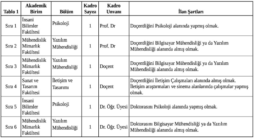 Doçent Kadrosu: Yazılım Mühendisliği ve İletişim Tasarımı bölümleri için doçent alımı planlanıyor. İletişim Tasarımı adaylarının sinema ve iletişim araştırmaları alanında çalışmalarınun bulunması gerekiyor.