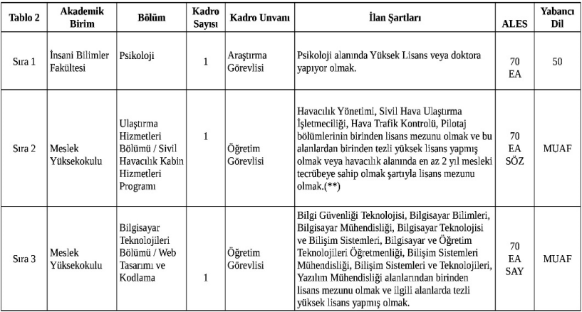 Öğretim üyesi dışındaki akademik personel alımları Psikoloji, Sivil Havacılık Kabin Hizmetleri ve Web Tasarımı ve Kodlama programlarını kapsıyor.