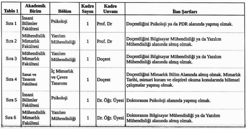 Üniversite bünyesinde açılan kadrolar İnsani Bilimler, Mühendislik-Mimarlık ile Sanat ve Tasarım fakültelerini kapsıyor. İlan edilen kontenjanlarda bazı özel şartlar aranıyor.