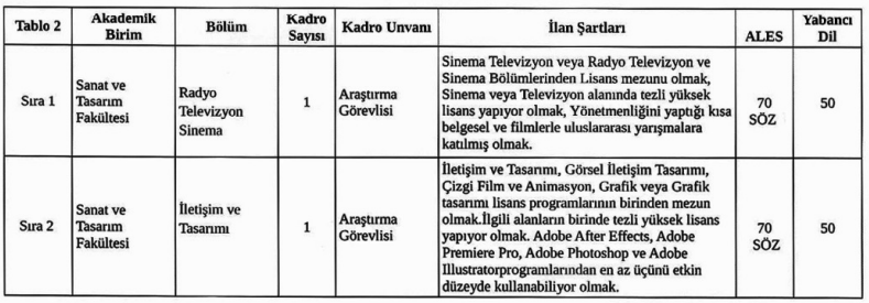 - Araştırma Görevlisi Kadroları: Radyo, Televizyon ve Sinema ile İletişim ve Tasarımı bölümlerine de tezli yüksek lisans süreci devam eden araştırmacılar alınacak.