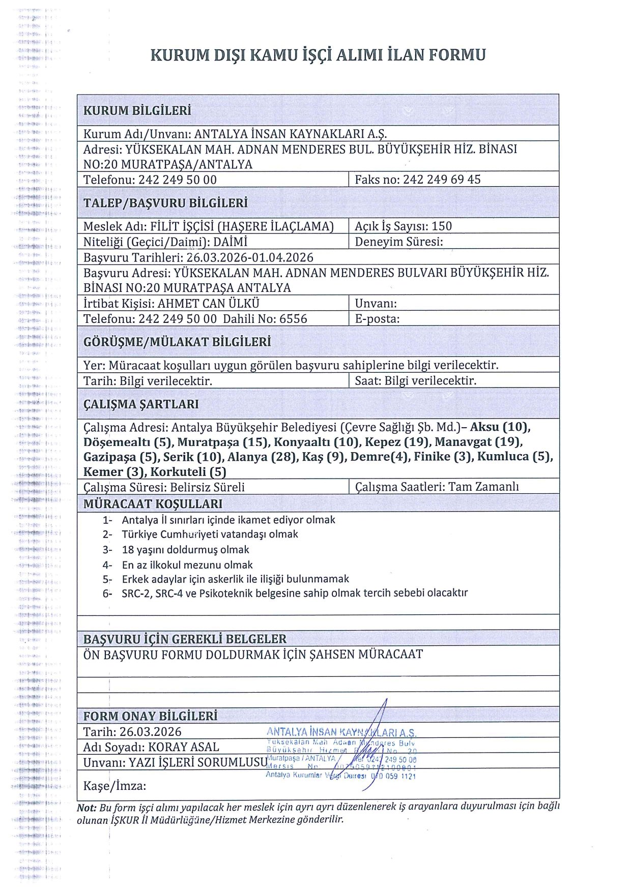 ANTALYA Büyükşehir Belediyesi, İŞKUR üzerinden yayımladığı ilanlarla bünyesine yeni personeller katmaya hazırlanıyor. Yayımlanan dört farklı ilan formuna göre; haşere ilaçlama, temizlik, şoförlük ve beden işçiliği alanlarında 259 kişilik istihdam sağlanacak. Başvurular şahsen yapılacak olup adayların belirli genel ve özel şartları taşıması gerekiyor.