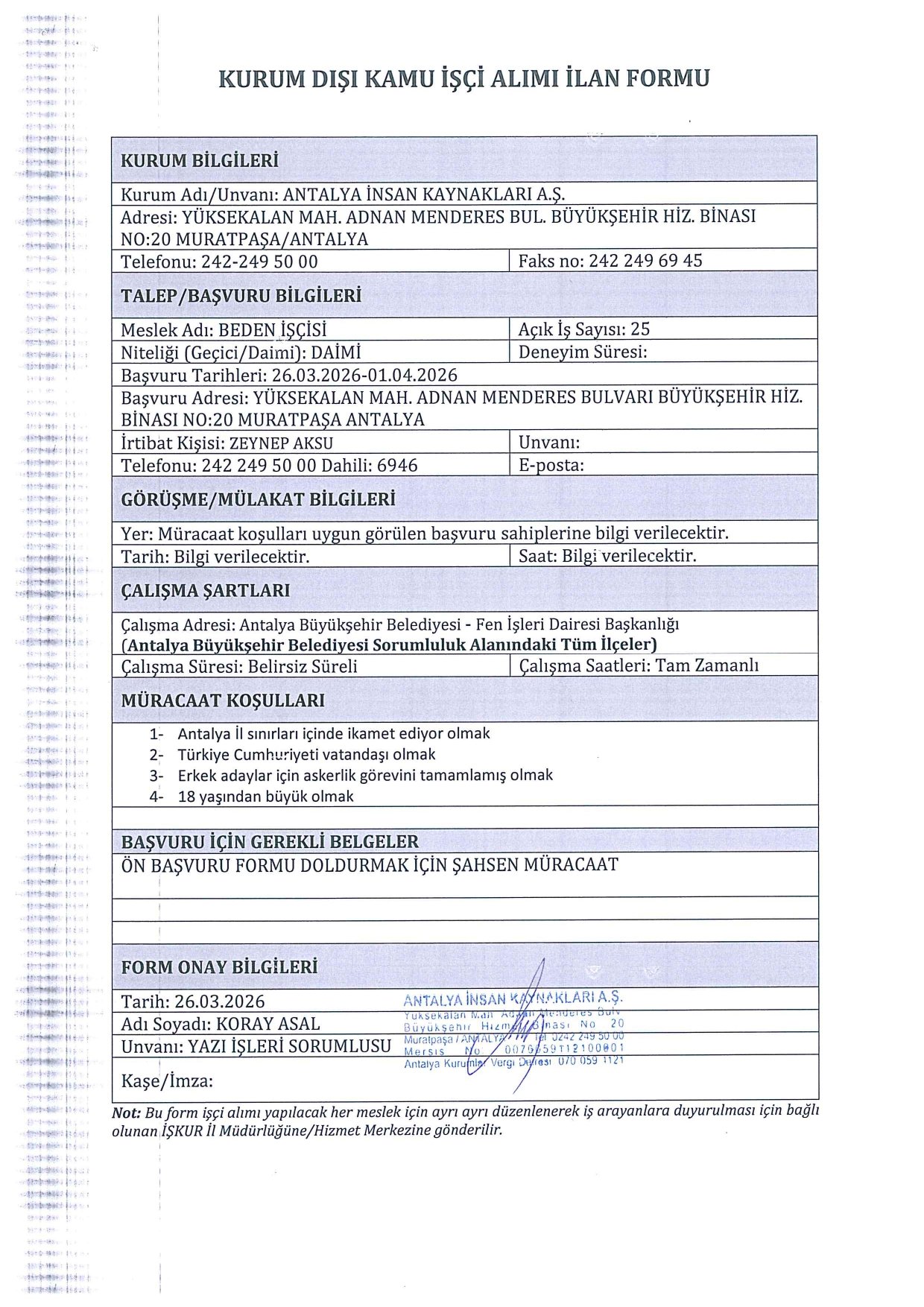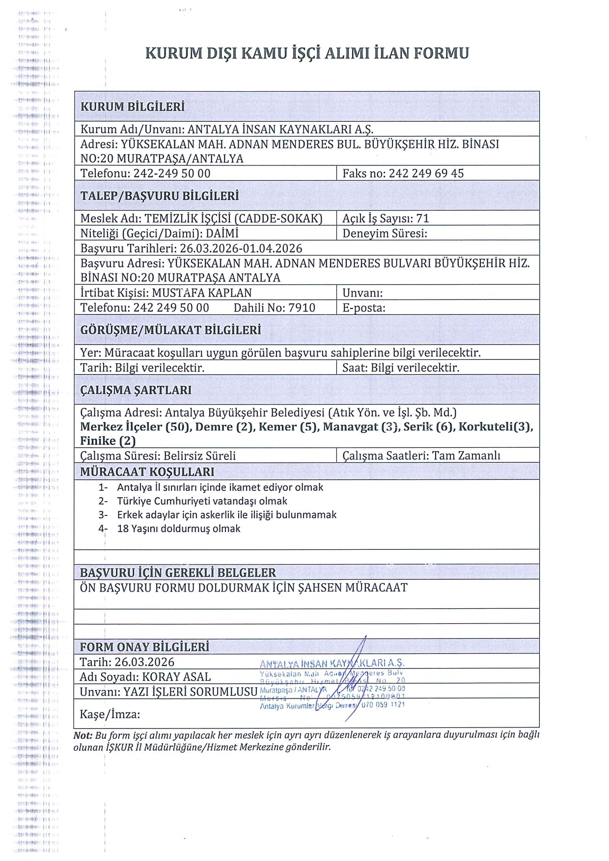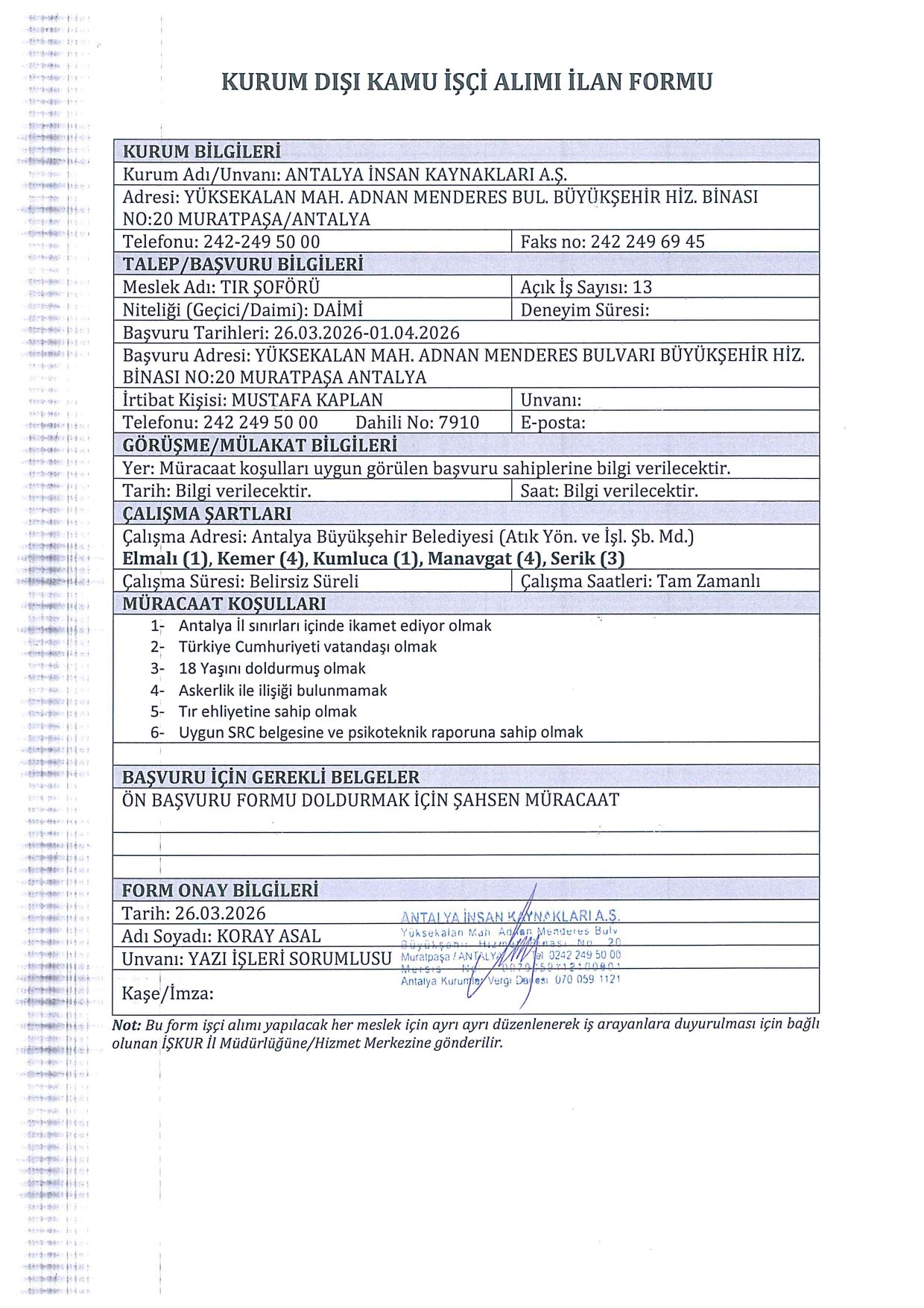 Adayların Türkiye Cumhuriyeti vatandaşı olması, 18 yaşını doldurmuş olması ve Antalya il sınırları içerisinde ikamet etmesi temel şartlar arasında yer alıyor. Ayrıca kadrolara göre askerlik durumu, eğitim düzeyi ve mesleki belge (SRC, Psikoteknik vb.) gibi özel koşullar aranıyor. Başvuru tarihi 26 Mart 2026 tarihinde başlarken 1 Nisan 2026 tarihi başvurular için son gün.