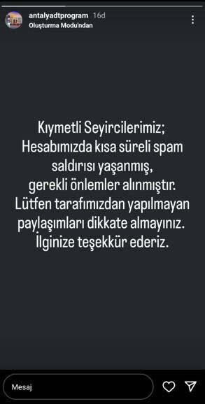 20 binin üzerinde kişinin takip ettiği sosyal medya sayfasının kısa süre içerisinde eski haline geri döndüğü gözlendi. Konu ile alakalı aynı sosyal medya sayfasından Antalya Devlet Tiyatrosu adına yapılan paylaşımda, “Kıymetli seyircilerimiz hesabımızda kısa süreli spam saldırısı yaşanmış gerekli önlemler alınmıştır. Lütfen tarafımızdan yapılmayan paylaşıma dikkate almayınız. İlginize teşekkür ederiz” ifadelerinin yer aldığı bir açıklamaya yayınlandı.