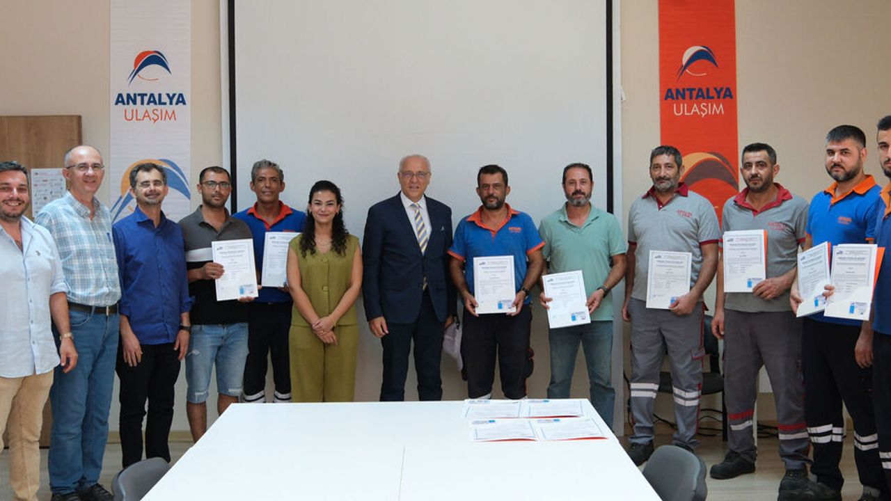 'Raylı Sistem Araçları Mekanik Bakım ve Onarımcısı' ile 'Demiryolu Yol Yapım, Bakım ve Onarımcısı' olarak görev yapan 12 teknik personel, kurum içi eğitimlerini tamamladıktan sonra İstanbul Uygulamalı Gaz ve Enerji Teknolojileri Araştırma Mühendislik Sanayi ve Ticaret A.Ş. Eğitim ve Belgelendirme Şefliği (UGETAM) tarafından düzenlenen yazılı ve uygulamalı sınavlarda başarılı oldu. Eğitimleri tamamlayan teknik personele sertifikaları, Antalya Ulaşım A.Ş. Genel Müdürü Melih Dipova tarafından takdim edildi.
