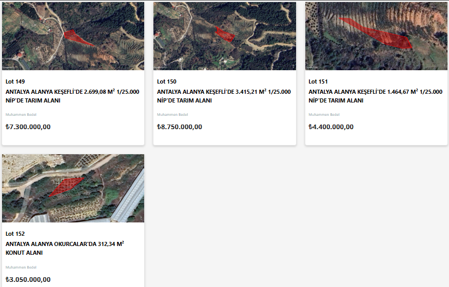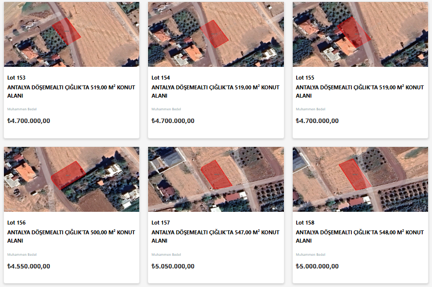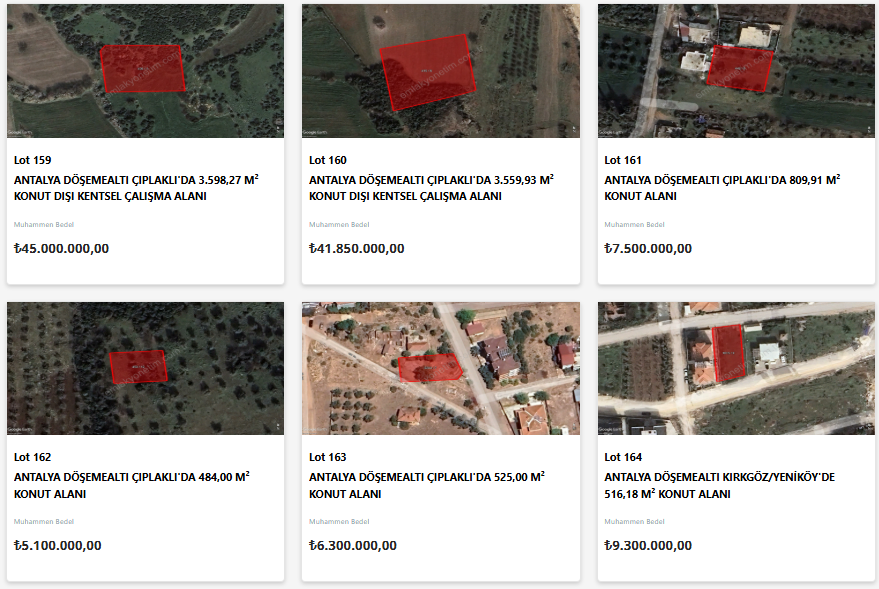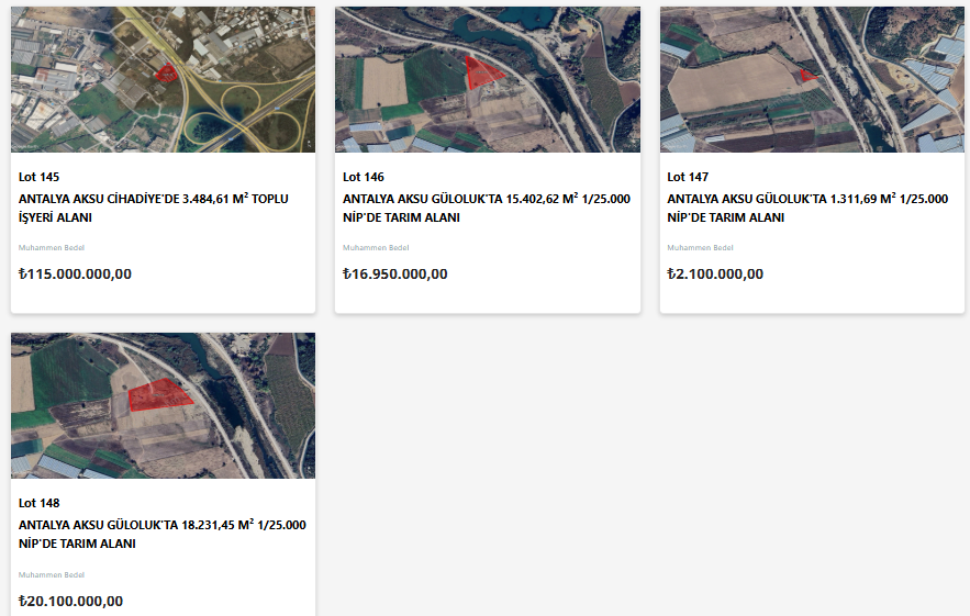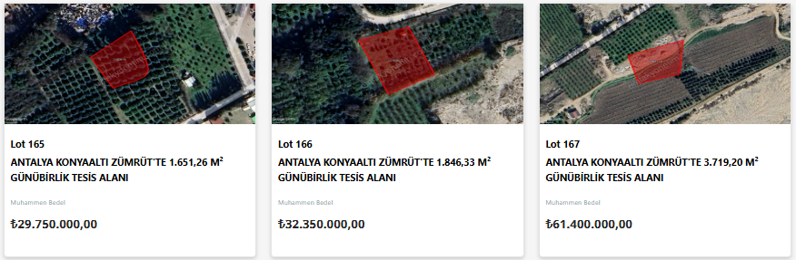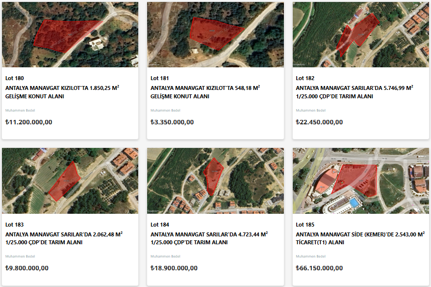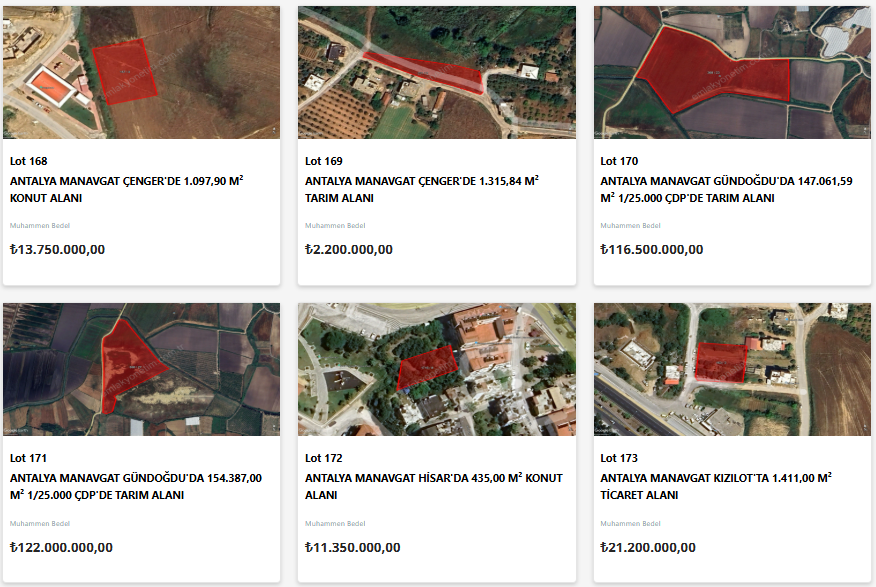 Yatırımcıların gözdesi olan Antalya’da satışa sunulan taşınmazlar turizm, ticaret ve tarımsal potansiyeli yüksek olan ilçelerde yoğunlaşıyor. Aksu'da toplu iş yeri alanı ve tarım alanları; Alanya'da tarım alanları ve konut alanı; Döşemealtı'da konut alanları, konut dışı kentsel çalışma alanı, günü birlik tesis alanı; Konyaaltı'da günü birlik tesis alanı; Manavgat'ta konut alanı, gelişme konut alanı, plansız alan, tarım alanı ve ticaret alanı; Serik'te kültürel ve sosyal tesis alanı satışa sunulacak.