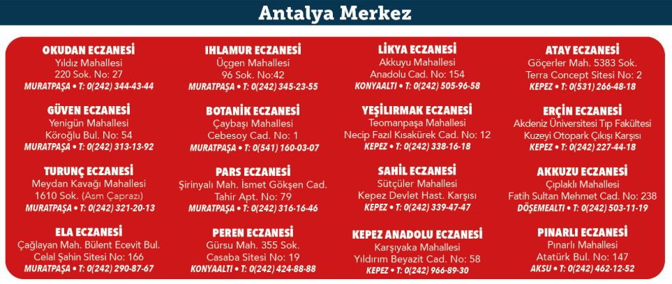 İşte Antalya'nın merkez ilçelerinde 3 Ocak 2025 nöbetçi eczane listesi;