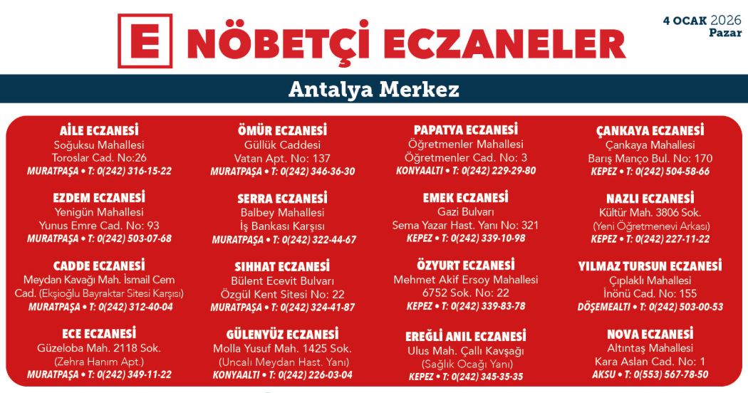 İşte Antalya'nın merkez ilçelerinde 4 Ocak 2025 nöbetçi eczane listesi;