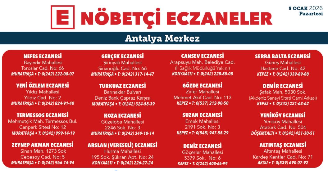 İşte Antalya'nın merkez ilçelerinde 5 Ocak 2025 nöbetçi eczane listesi;