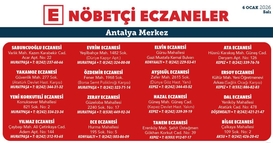 İşte Antalya'nın merkez ilçelerinde 5 Ocak 2025 nöbetçi eczane listesi;
