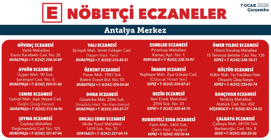 İşte Antalya'nın merkez ilçelerinde 5 Ocak 2025 nöbetçi eczane listesi;