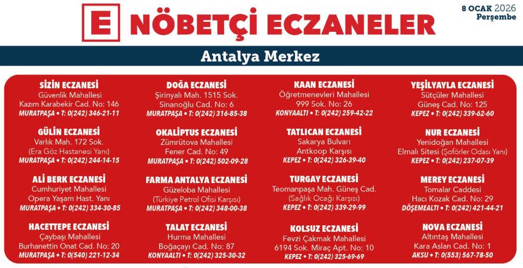 İşte Antalya'nın merkez ilçelerinde 5 Ocak 2025 nöbetçi eczane listesi;