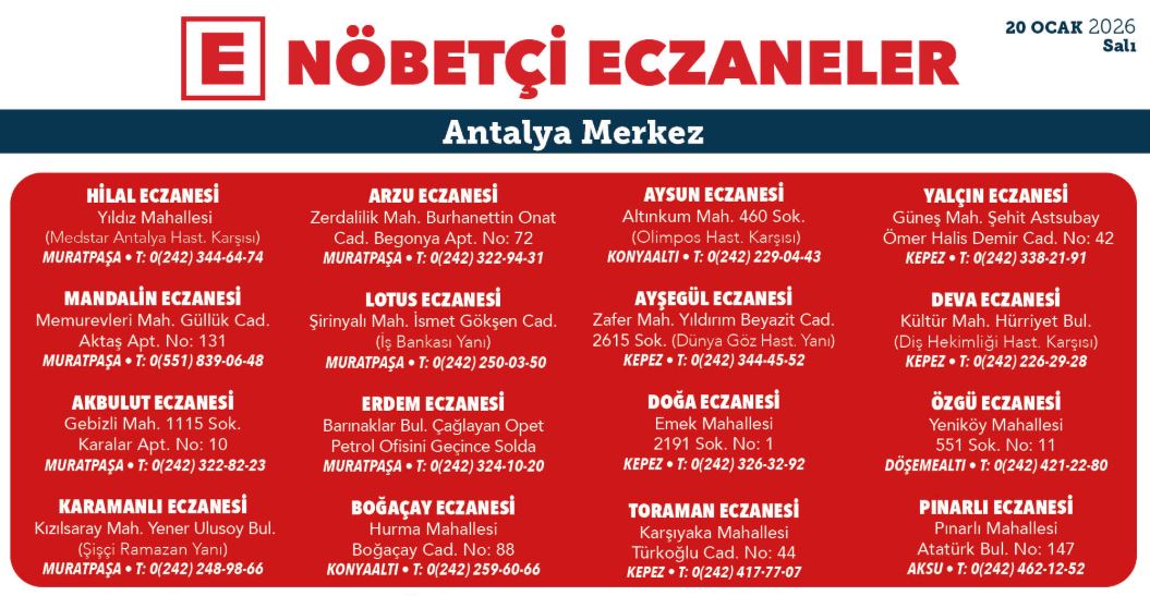 İşte Antalya'nın merkez ilçelerinde 20 Ocak 2025 nöbetçi eczane listesi;