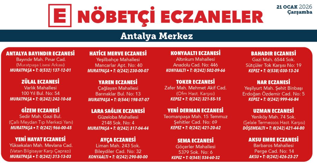 İşte Antalya'nın merkez ilçelerinde 21 Ocak 2025 nöbetçi eczane listesi;