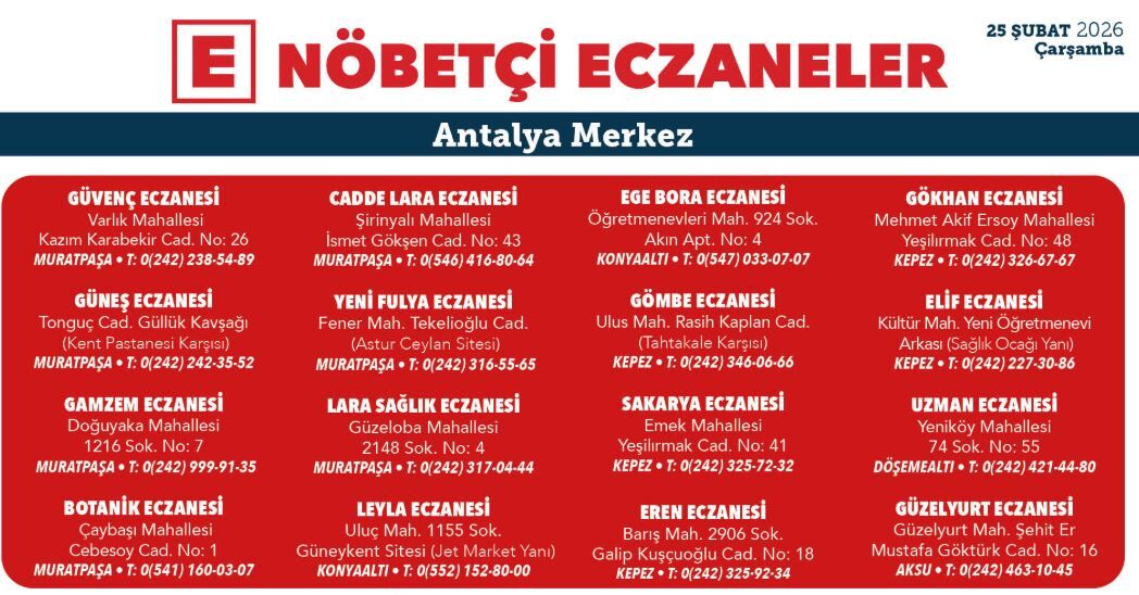 İşte Antalya'nın merkez ilçelerinde bugünkü nöbetçi eczane listesi;