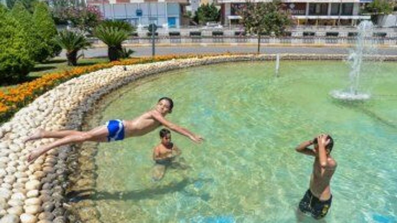 Antalya'da sıcaktan bunalan çocuklar, elektrik sisteminden kaynaklı olası kaçak akım tehlikesinin olduğu, içerisinde aydınlatma ve fıskiye sistemi bulunan süs havuzlarında serinledi