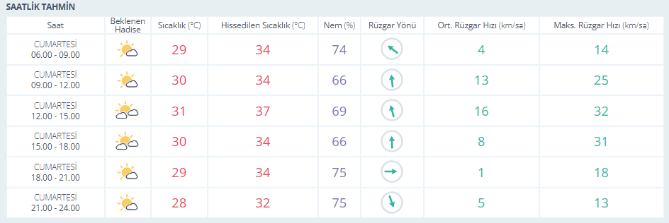 Meteoroloji Genel Müdürlüğü tarafından yapılan son değerlendirmelere göre, Antalya’da parçalı bulutlu bir gün beklenirken hissedilen en yüksek sıcaklık 37, en düşük 32 derece olacak. En düşük nem 66 en yüksek nem ise 75. Rüzgarın saatteki ortalama hızı en yüksek 13 km olarak tahmin ediliyor.