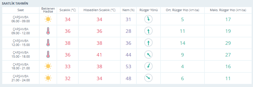 Meteoroloji Genel Müdürlüğü tarafından yapılan son değerlendirmelere göre, Antalya’da parçalı bulutlu bir gün beklenirken hissedilen en yüksek sıcaklık 38, en düşük 28 derece olacak. En düşük nem 27 en yüksek nem ise 53. Rüzgarın saatteki hızı 14 km olarak tahmin ediliyor.