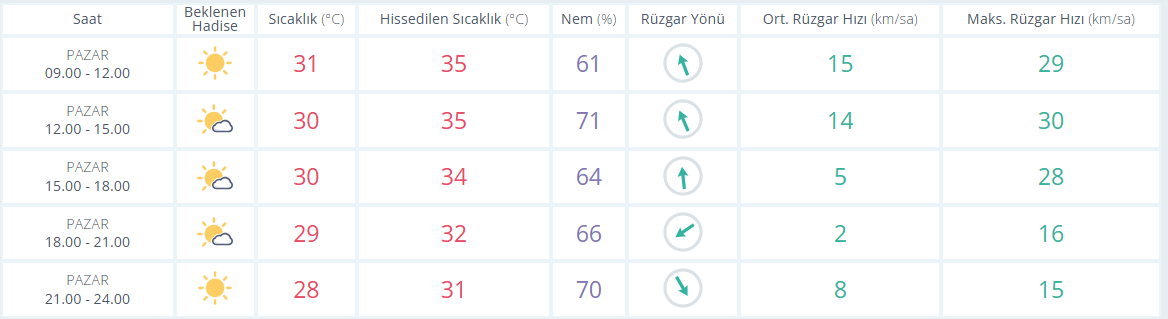 Meteoroloji Genel Müdürlüğü tarafından yapılan son değerlendirmelere göre, Antalya’da güneşli ve az bulutlu bir gün beklenirken hissedilen en yüksek sıcaklık 35, en düşük 31 derece olacak. En düşük nem 61 en yüksek nem ise 71. Rüzgarın saatteki hızı ortalama en yüksek 14 km olarak tahmin ediliyor.