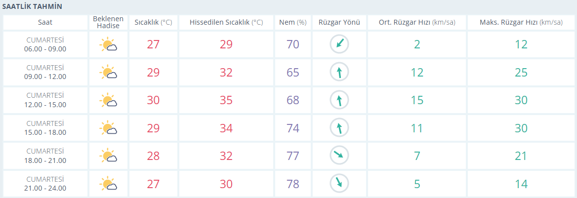Meteoroloji Genel Müdürlüğü tarafından yapılan son değerlendirmelere göre, Antalya’da az bulutlu bir gün beklenirken hissedilen en yüksek sıcaklık 35, en düşük 29 derece olacak. En düşük nem 65 en yüksek nem ise 78. Rüzgarın saatteki hızı ortalama en yüksek 15 km olarak tahmin ediliyor.