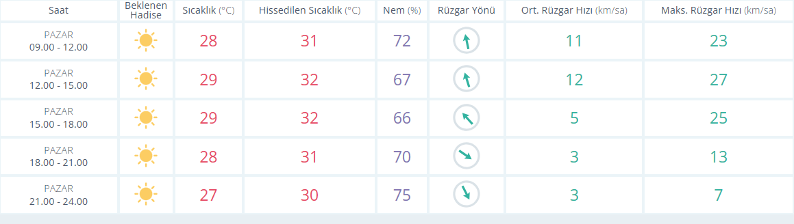 Meteoroloji Genel Müdürlüğü tarafından yapılan son değerlendirmelere göre, Antalya’da az bulutlu bir gün beklenirken hissedilen en yüksek sıcaklık 32, en düşük 30 derece olacak. En düşük nem 66 en yüksek nem ise 75. Rüzgarın saatteki hızı 12 km olarak tahmin ediliyor.