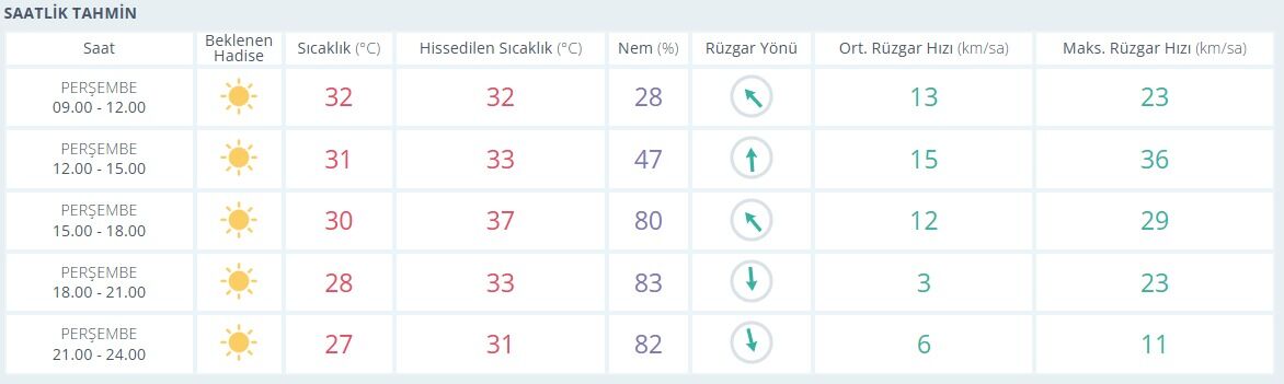 Meteoroloji Genel Müdürlüğü tarafından yapılan son değerlendirmelere göre, Antalya’da açık bir gün beklenirken hissedilen en yüksek sıcaklık 37, en düşük 31 derece olacak. En düşük nem 28 en yüksek nem ise 83. Rüzgarın saatteki hızı 5 km olarak tahmin ediliyor.