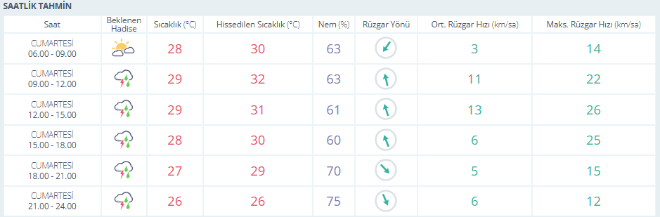 Meteoroloji Genel Müdürlüğü tarafından yapılan son değerlendirmelere göre, Antalya’da gökgürültülü sağanak yağmurlu bir gün bekleniyor. Hissedilen en yüksek sıcaklık 31, en düşük 26 derece olacak. En düşük nem 60 en yüksek nem ise 75. Rüzgarın saatteki hızı ortalama en yüksek 13 km olarak tahmin ediliyor.