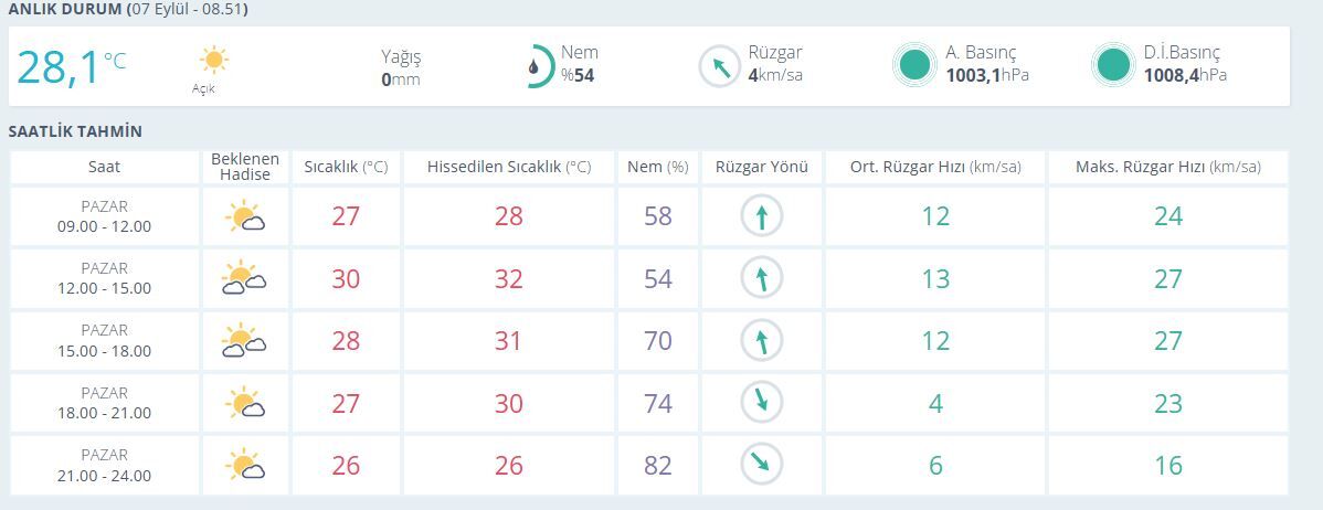 Meteoroloji Genel Müdürlüğü tarafından yapılan son değerlendirmelere göre, Antalya’da gökgürültülü sağanak yağmurlu ve yer yer parçalı bulutlu bir gün bekleniyor. Hissedilen en yüksek sıcaklık 30, en düşük 20 derece olacak. En düşük nem 50 en yüksek nem ise 75. Rüzgarın saatteki hızı ortalama en yüksek 25 km olarak tahmin ediliyor.