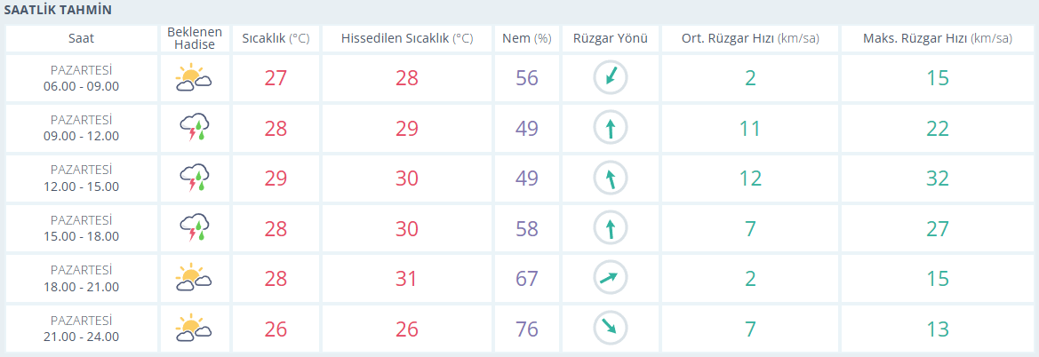 Meteoroloji Genel Müdürlüğü tarafından yapılan son değerlendirmelere göre, Antalya’da gökgürültülü sağanak yağmurlu ve yer yer parçalı bulutlu bir gün bekleniyor. Hissedilen en yüksek sıcaklık 31, en düşük 26 derece olacak. En düşük nem 49 en yüksek nem ise 76. Rüzgarın saatteki hızı ortalama en yüksek 12km olarak tahmin ediliyor.