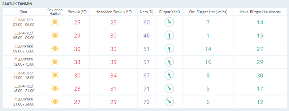 Meteoroloji Genel Müdürlüğü tarafından yapılan son değerlendirmelere göre, Antalya’da güneşli bir gün beklenirken hissedilen en yüksek sıcaklık 39, en düşük 25 derece olacak. En düşük nem 46 en yüksek nem ise 72. Rüzgarın saatteki ortalama en yüksek hızı 16 km olarak tahmin ediliyor.