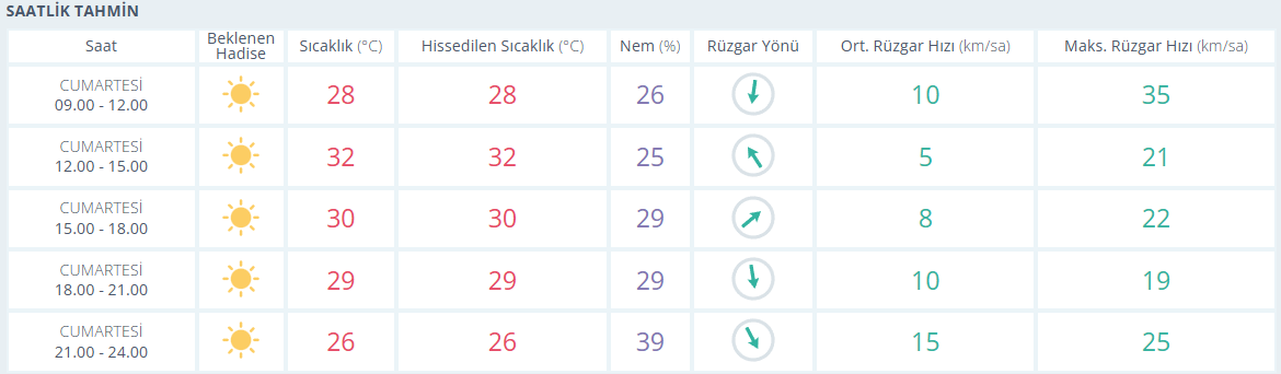 Meteoroloji Genel Müdürlüğü tarafından yapılan son değerlendirmelere göre, Antalya’da güneşli bir gün beklenirken hissedilen en yüksek sıcaklık 32, en düşük 26 derece olacak. En düşük nem 25 en yüksek nem ise 39. Rüzgarın saatteki hızı ortalama en yüksek 15 km olarak tahmin ediliyor.