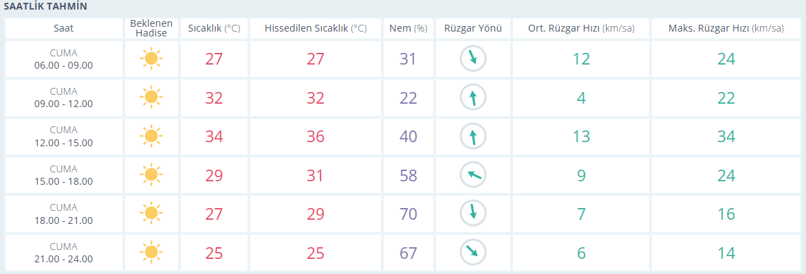 Meteoroloji Genel Müdürlüğü tarafından yapılan son değerlendirmelere göre, Antalya’da güneşli bir gün beklenirken hissedilen en yüksek sıcaklık 36, en düşük 25 derece olacak. En düşük nem 22 en yüksek nem ise 70. Rüzgarın saatteki hızı ortalama en yüksek 13 km olarak tahmin ediliyor.