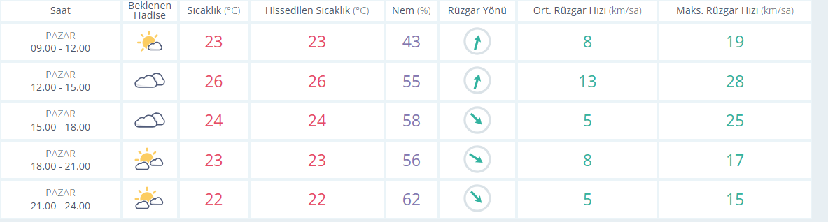 Meteoroloji Genel Müdürlüğü tarafından yapılan son değerlendirmelere göre, Antalya’da parçalı az bulutlu ve bulutlu bir gün beklenirken hissedilen en yüksek sıcaklık 26, en düşük 22 derece olacak. En düşük nem 43 en yüksek nem ise 62. Rüzgarın saatteki hızı ortalama en yüksek 12 km olarak tahmin ediliyor.