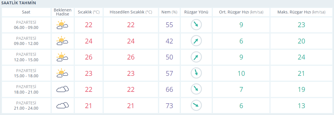 Meteoroloji Genel Müdürlüğü tarafından yapılan son değerlendirmelere göre, Antalya’da parçalı az bulutlu ve bulutlu bir gün beklenirken hissedilen en yüksek sıcaklık 26, en düşük 21 derece olacak. En düşük nem 42 en yüksek nem ise 73. Rüzgarın saatteki hızı ortalama en yüksek 10 km olarak tahmin ediliyor.