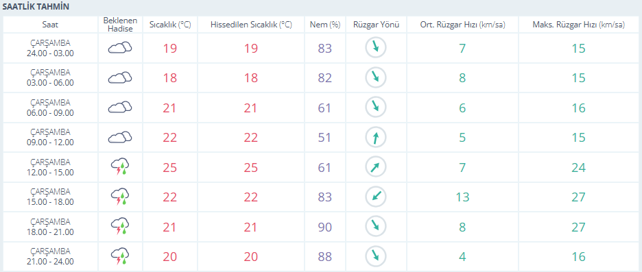 Meteoroloji Genel Müdürlüğü tarafından yapılan son değerlendirmelere göre, Antalya’da sabah saatlerinde çok bulutlu bir gün beklenirken öğleden sonra ise gökgürültülü sağanak yağış bekleniyor. Hissedilen en yüksek sıcaklık 25, en düşük 18 derece olacak. En düşük nem 51 en yüksek nem ise 90. Rüzgarın saatteki ortalama hızı en yüksek 13 km olarak tahmin ediliyor.