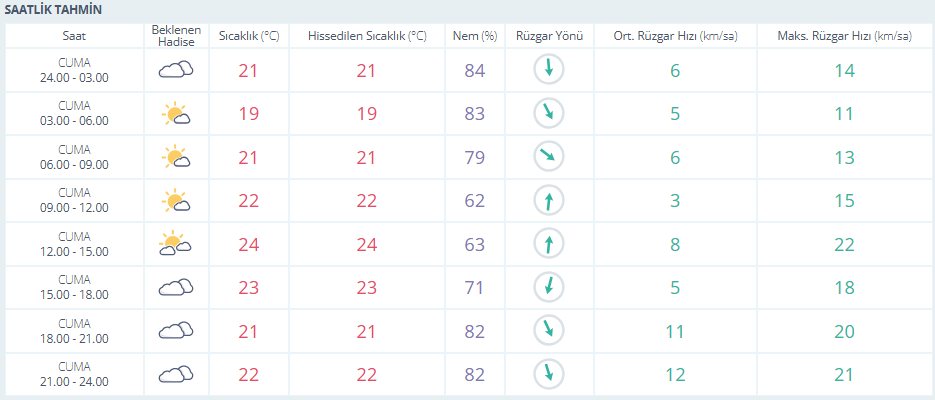 Meteoroloji Genel Müdürlüğü tarafından yapılan son değerlendirmelere göre, Antalya’da parçalı bulutlu bir gün beklenirken hissedilen en yüksek sıcaklık 24, en düşük 21 derece olacak. En düşük nem 63 en yüksek nem ise 84. Rüzgarın saatteki ortalama en yüksek hızı 12 km olarak tahmin ediliyor.