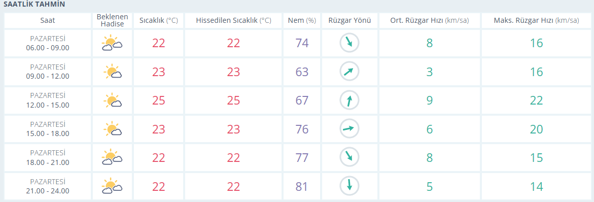 Meteoroloji Genel Müdürlüğü tarafından yapılan son değerlendirmelere göre, Antalya’da parçalı bulutlu bir gün beklenirken hissedilen en yüksek sıcaklık 25, en düşük 22 derece olacak. En düşük nem 63 en yüksek nem ise 81. Rüzgarın saatteki en yüksek hızı ise 22 km olarak tahmin ediliyor.