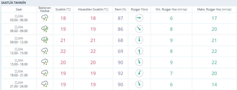 Meteoroloji Genel Müdürlüğü tarafından yapılan son değerlendirmelere göre, Antalya’da gökgürültülü sağanak yağışlı bir gün beklenirken hissedilen en yüksek sıcaklık 22, en düşük 18 derece olacak. En düşük nem 68 en yüksek nem ise 92. Rüzgarın saatteki hızı ortalama en yüksek 9 km olarak tahmin ediliyor.
