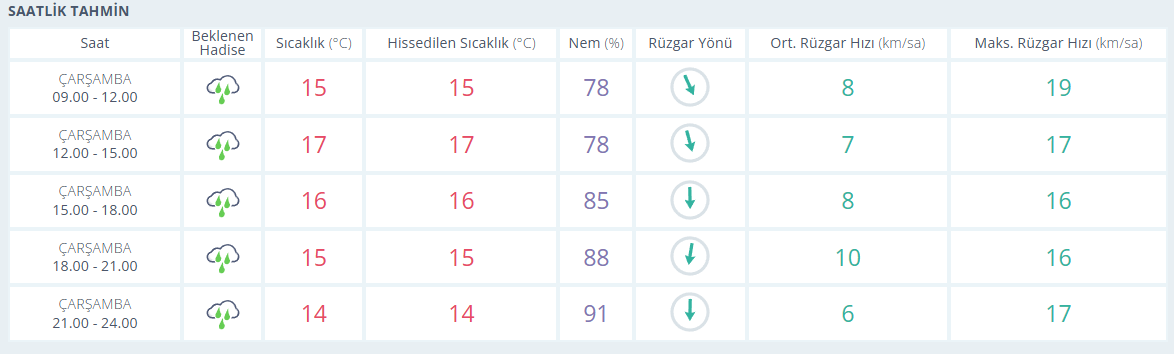 Meteoroloji Genel Müdürlüğü tarafından yapılan son değerlendirmelere göre, Antalya’da kuvvetli gökgürültülü sağanak yağışlı bir gün beklenirken hissedilen en yüksek sıcaklık 17, en düşük 14 derece olacak. En düşük nem 78 en yüksek nem ise 91. Rüzgarın saatteki hızı en yüksek 19 km olarak tahmin ediliyor.