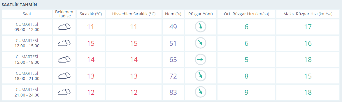 Meteoroloji Genel Müdürlüğü tarafından yapılan son değerlendirmelere göre, Antalya’da çok bulutlu bir gün beklenirken hissedilen en yüksek sıcaklık 15, en düşük 11 derece olacak. En düşük nem 49 en yüksek nem ise 83. Rüzgarın saatteki en yüksek hızı 18 km olarak tahmin ediliyor.