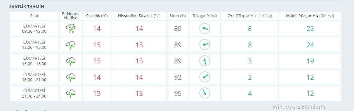 Meteoroloji Genel Müdürlüğü tarafından yapılan son değerlendirmelere göre, Antalya’da yağmurlu bir gün beklenirken hissedilen en yüksek sıcaklık 15, en düşük 13 derece olacak. En düşük nem 89 en yüksek nem ise 95. Rüzgarın saatteki hızı 3 km olarak tahmin ediliyor.