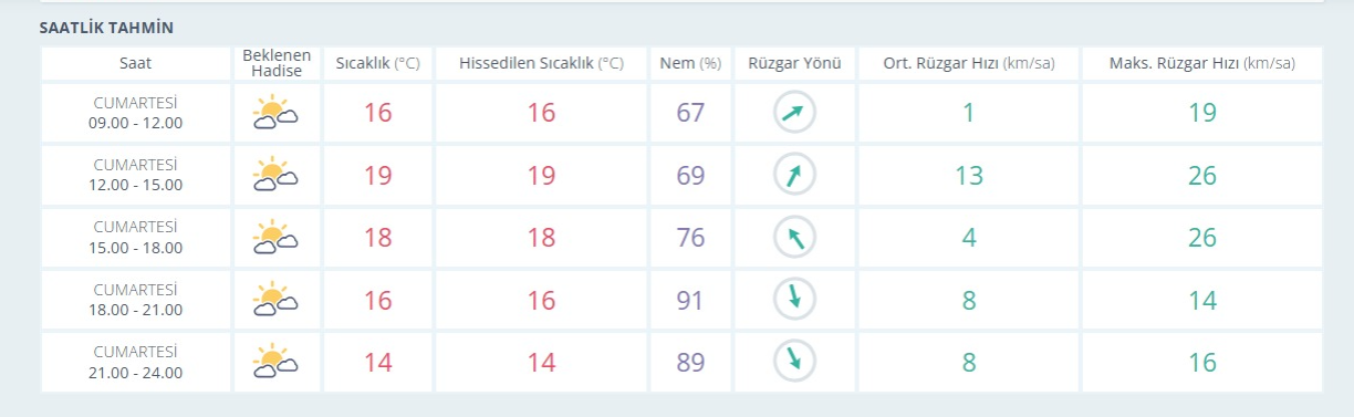 Meteoroloji Genel Müdürlüğü tarafından yapılan son değerlendirmelere göre, Antalya’da parçalı bulutlu bir gün beklenirken hissedilen en yüksek sıcaklık 19, en düşük 14 derece olacak. En düşük nem 67 en yüksek nem ise 91. Rüzgarın saatteki hızı 11 km olarak tahmin ediliyor.