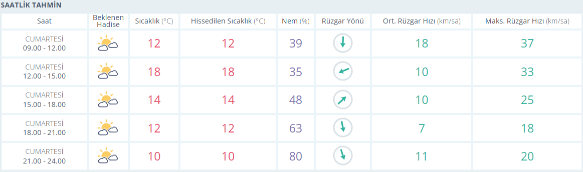 Meteoroloji Genel Müdürlüğü tarafından yapılan son değerlendirmelere göre, Antalya’da parçalı bulutlu bir gün beklenirken hissedilen en yüksek sıcaklık 18, en düşük 10 derece olacak. En düşük nem 35 en yüksek nem ise 80. Rüzgarın saatteki hızı ortalama en yüksek 37 km olarak tahmin ediliyor.