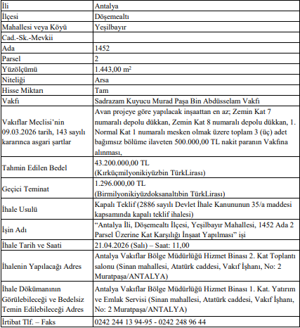 ANTALYA Vakıflar Bölge Müdürlüğü, mülkiyeti Sadrazam Kuyucu Murad Paşa Bin Abdüsselam Vakfı’na ait olan taşınmazı yatırıma açıyor. 25 Mart 2026 tarihli Resmi Gazete'de yayımlanan ilana göre, Döşemealtı ilçesi Yeşilbayır Mahallesi sınırları içerisinde yer alan arsa vasfındaki taşınmaz, 2886 sayılı Devlet İhale Kanunu uyarınca ‘Kapalı Teklif Usulü’ ile ihale edilecek. Söz konusu proje, bölgedeki yapılaşma faaliyetlerine yeni bir soluk getirmeyi hedeflerken vakıf kültür varlıklarının ekonomik değerini artırmayı amaçlıyor.